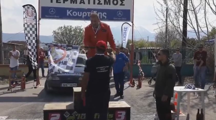 Συγκινητική ήταν η στιγμή όταν ο πρωταθλητής Ελλάδος Δημήτρης Καρατσομπαλίδης παραλαμβάνοντας την καρό σημαία μαζί με το Κύπελλο του ταχύτερου χρόνου ημέρας γύρισε στο βάθρο και αφιέρωσε την τιμητική καρό επετειακή σημαία στο Τάσο.